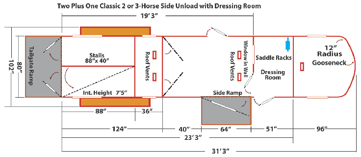Kingston’s All Aluminum Two Plus One Classic 2 or 3-Horse Gooseneck Side and Rear Unload trailer offers more comfort, convenience, safety and space than any other trailer in its class.